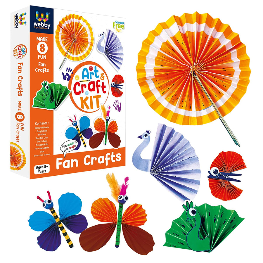 - CONTENTS: This kit contains all the required material to make different Fan. It contains ice-cream sticks, colour paper, pom pom ball, feathers, googly eyes, glue, sketch pens, bamboo chips and instructions manual.