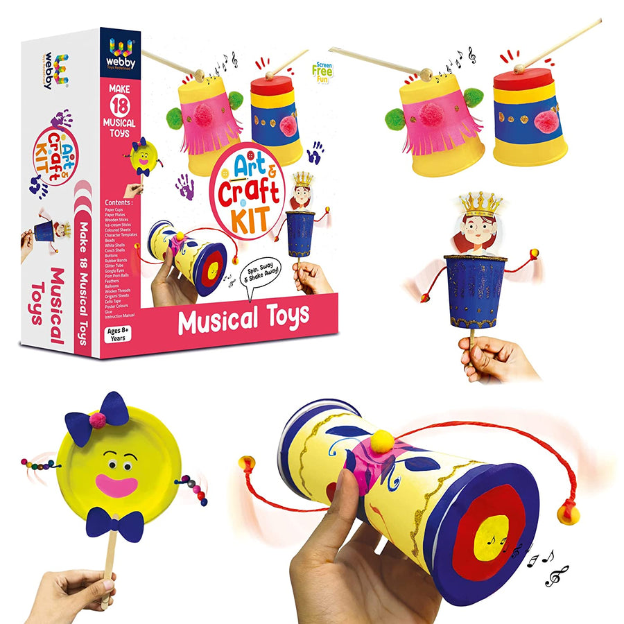 - CONTENTS: This kit contains all the required material to make different musical toys. It contains character template, origami paper, colour paper, Ice cream sticks, pom pom ball, paper plates, woolen threads, googly eyes, feathers, beads, balloons, cello tapes, white shells, conch shells, buttons, glue and instructions manual.
