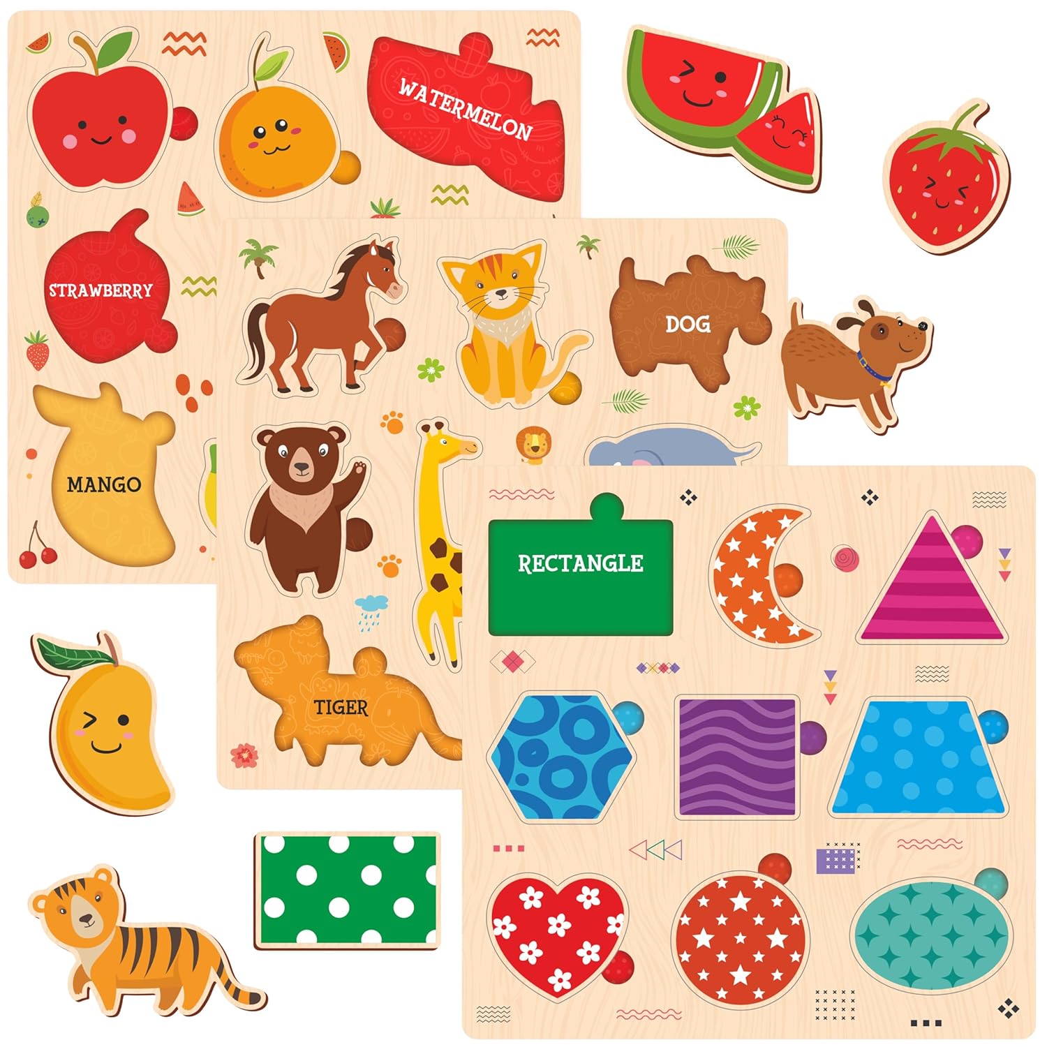 - EDUCATIONAL SET: Combo pack of 3 wooden puzzles featuring animals, shapes, and fruits for comprehensive learning and development
