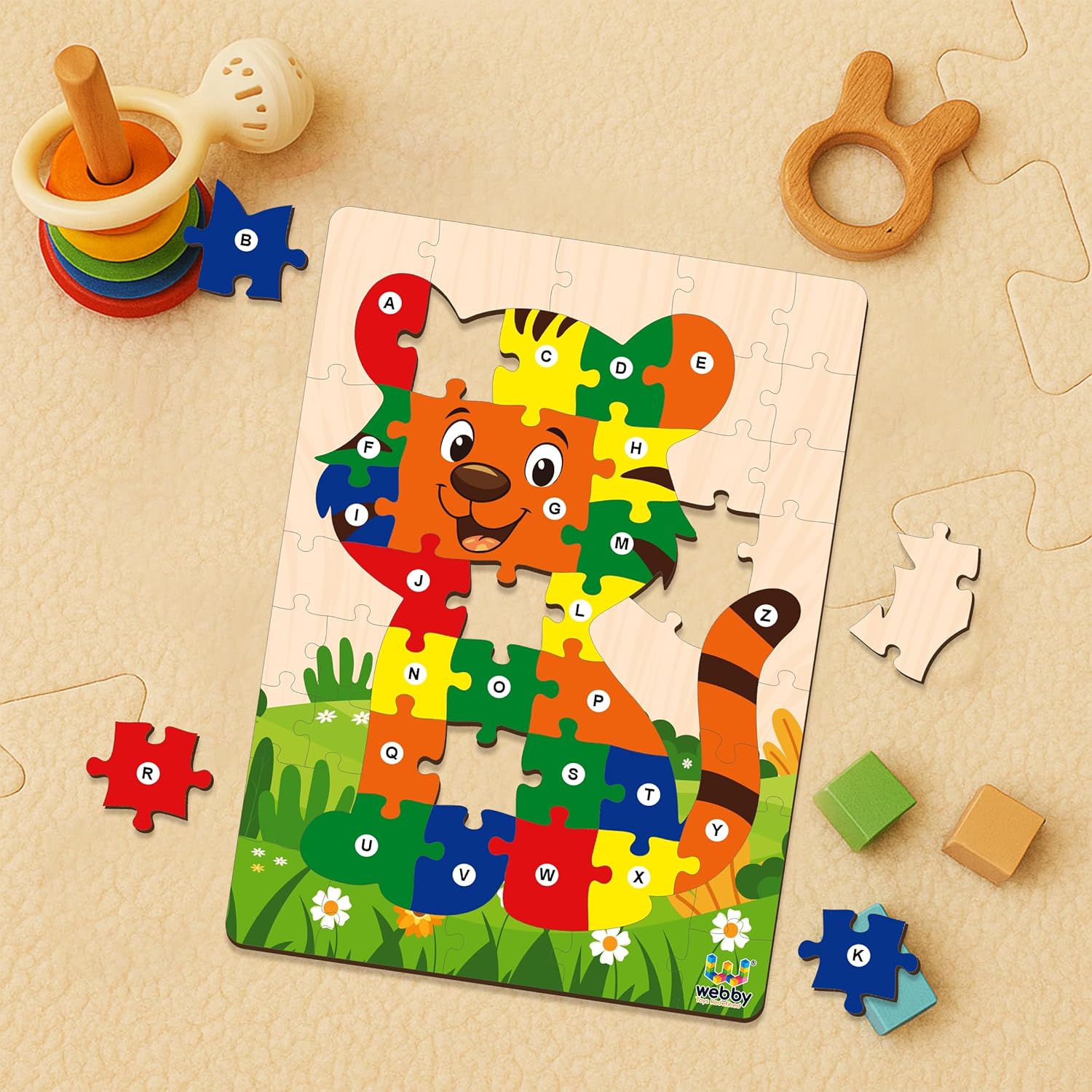 - EDUCATIONAL LEARNING: Tiger-shaped wooden puzzle featuring A-Z alphabet letters on 50 colourful pieces, helping children learn letter recognition whilst developing problem-solving skills